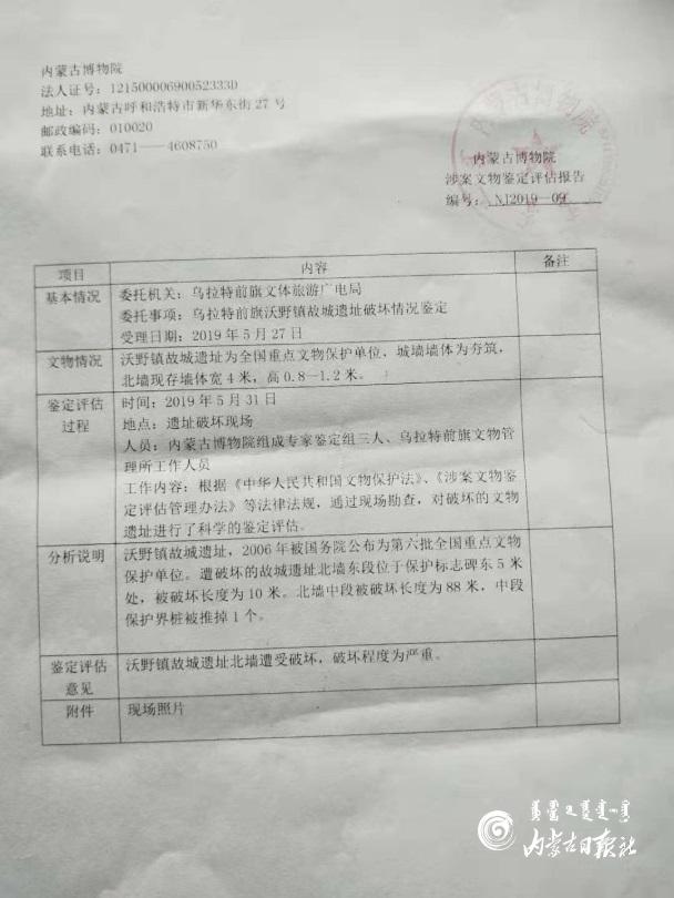 內(nèi)蒙古博物院出具的《涉案文物鑒定評估報告》
