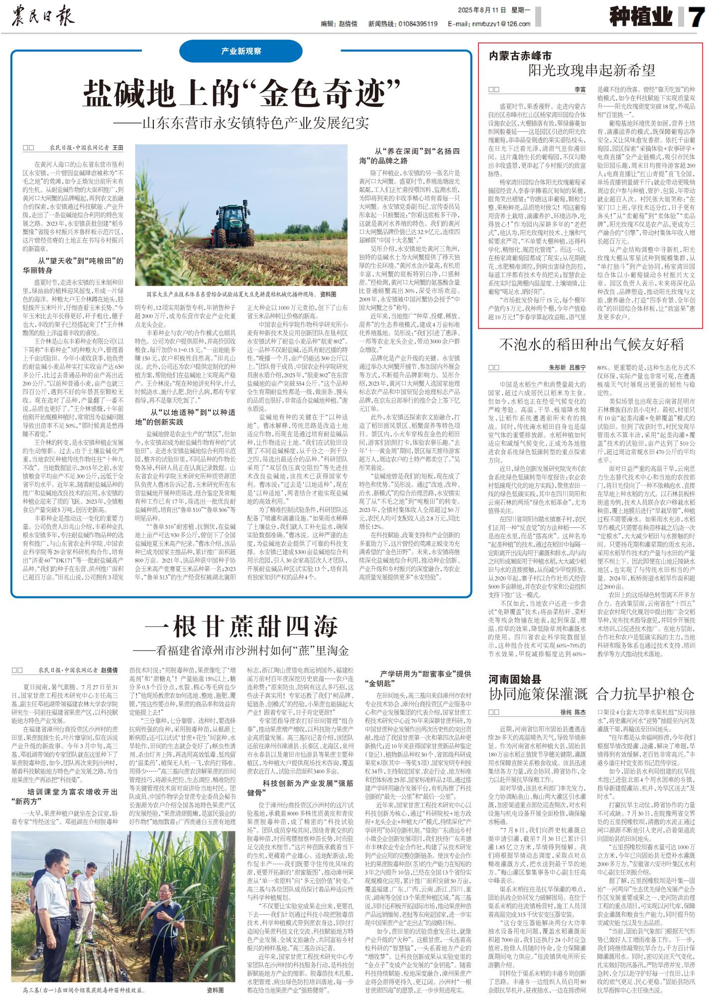 2025年8月11日,《農(nóng)民日報》第7版刊發(fā)題為《內(nèi)蒙古赤峰市:陽光玫瑰串起新希望》的文章,報道了內(nèi)蒙古赤峰市紅山區(qū)楊家灣田園綜合體設(shè)施農(nóng)業(yè)區(qū)引進的陽光玫瑰葡萄,串串晶瑩剔透的果實垂墜枝頭,在日光下泛著光澤,清甜氣息彌漫田間。這片蓬勃生長的葡萄園,不僅勾勒出豐收盛景,更串起了鄉(xiāng)村振興的致富脈絡(luò)。