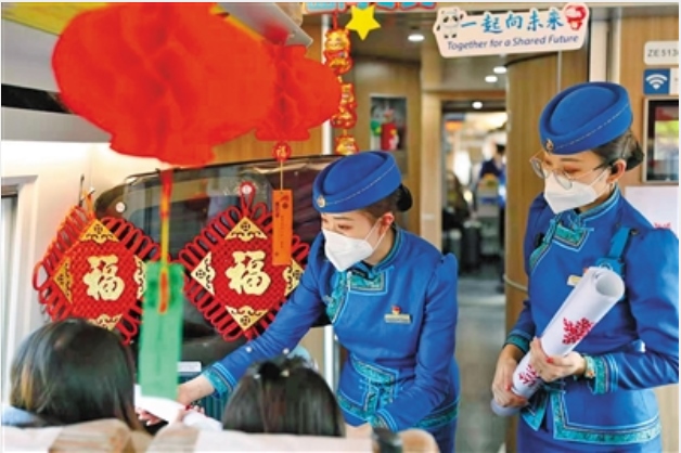 2022年2月15日,在包頭開(kāi)往北京北的G2494次復(fù)興號(hào)列車(chē)上,高鐵乘務(wù)員與旅客們一起度過(guò)溫暖又美好的旅程。