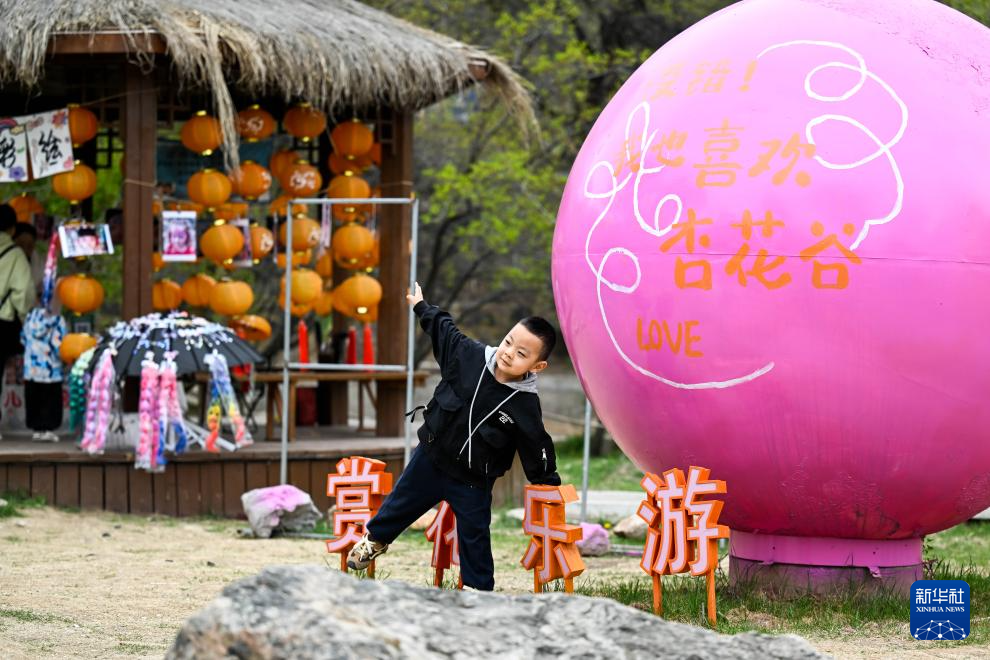5月4日,小朋友在位于回民區(qū)東烏素圖村的烏素圖杏花谷景區(qū)拍照。