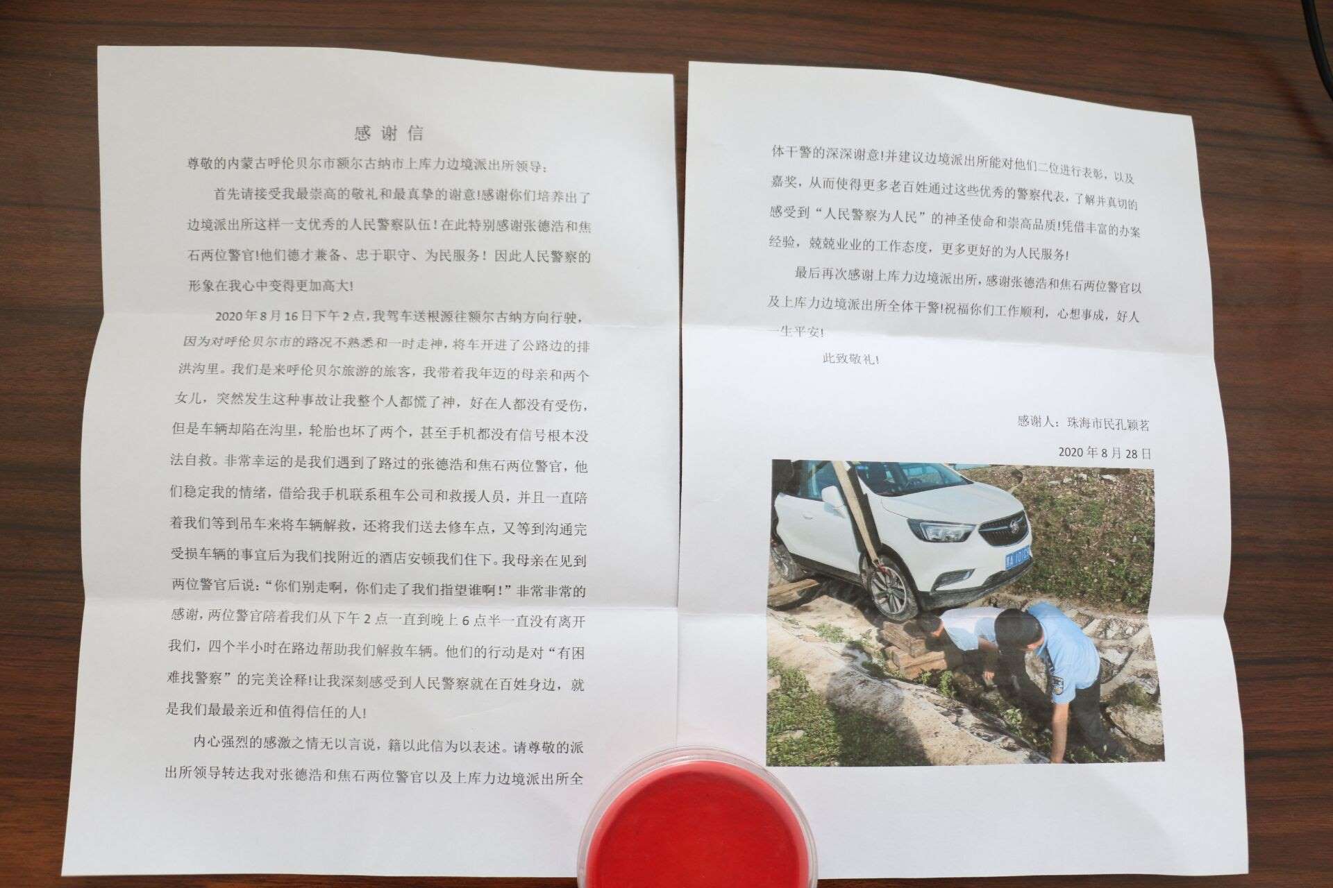 9月2日,印有“盡職盡責(zé)熱心為民,失而復(fù)得溫暖人心”的錦旗從北京郵寄到室韋邊境派出所;9月2日,一面印有“情系百姓,為民解憂”的錦旗被群眾送到恩和邊境派出所民警手中;9月3日,印有“人民衛(wèi)士,一心為民”的錦旗送到莫爾道嘎邊境派出所民警手中;9月4日,上庫力邊境派出所收到了從廣東珠江郵來了印有“人民警察為人民,服務(wù)群眾解民憂”的錦旗和一封感謝信...