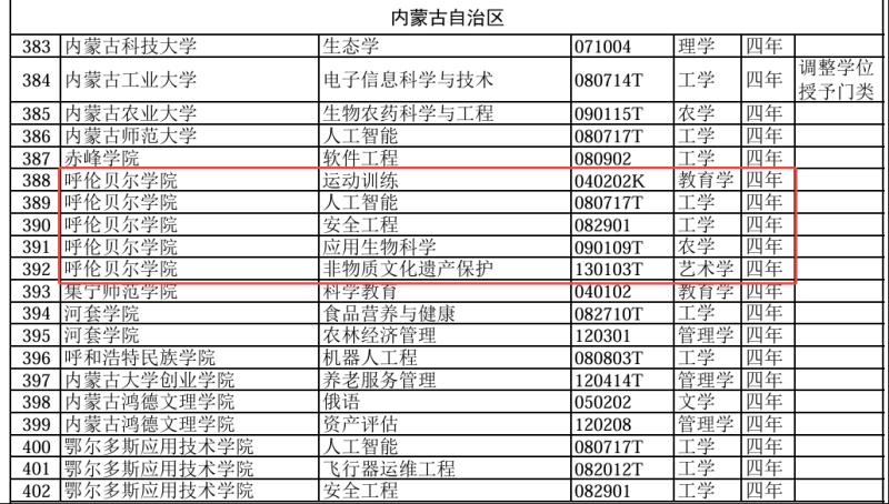 近日,教育部公布了《2024年度普通高等學(xué)校本科專業(yè)備案和審批結(jié)果》,其中,呼倫貝爾學(xué)院申報的“運動訓(xùn)練”(專業(yè)代碼040202K,教育學(xué))、“人工智能”(專業(yè)代碼080717T,工學(xué))、“安全工程”(專業(yè)代碼082901,工學(xué))、“應(yīng)用生物科學(xué)”(專業(yè)代碼090109T,農(nóng)學(xué))、“非物質(zhì)文化遺產(chǎn)保護(hù)”(專業(yè)代碼130103T,藝術(shù)學(xué))5個本科專業(yè)成功獲批。本次備案和審批的相關(guān)專業(yè),擬列入該校2025年本科招生計劃。