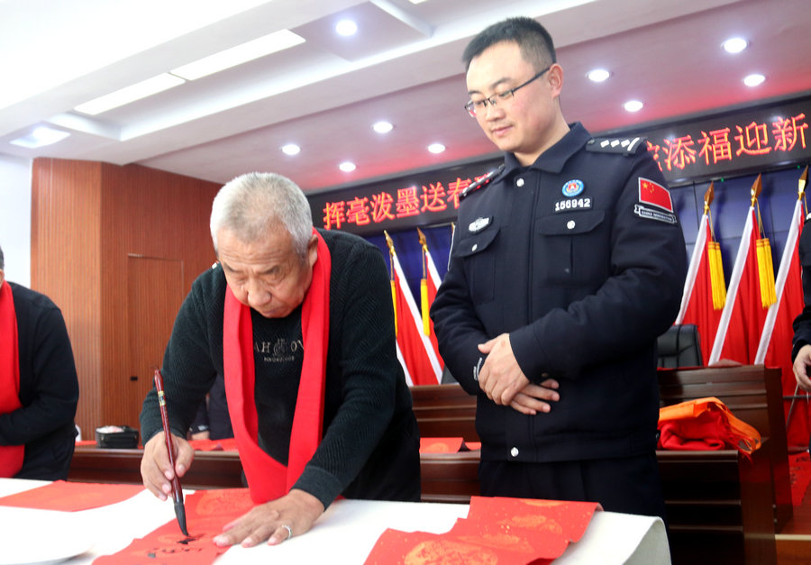 活動現(xiàn)場氣氛熱烈,書法家們鋪展紅紙、揮毫潑墨,將自己的書法造詣轉(zhuǎn)化為民警們喜聞樂見的傳統(tǒng)藝術(shù)形式,一幅幅吉祥如意的春聯(lián),一張張紅紅火火的“?!弊郑谡故緜鹘y(tǒng)文化之美的同時(shí),傳遞著冬日溫暖,營造出文明祥和、時(shí)尚雅致的節(jié)日氛圍,讓在場人員感到了濃濃的年味。