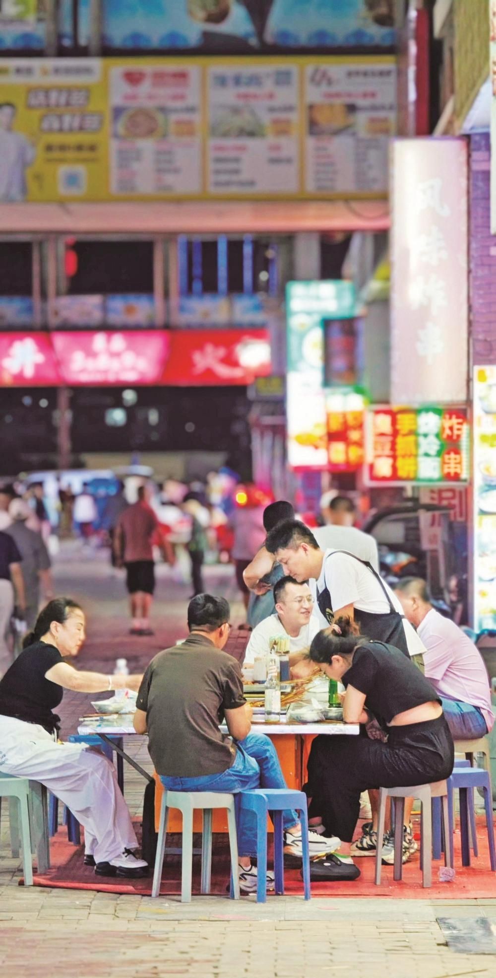 炭火上的羊肉串嗞嗞作響,油脂滴落,迸出金色火花,散發(fā)出誘人的香氣??腿藝谒芰闲∽琅?,手里拿著冰鎮(zhèn)啤酒,碰杯傳出清脆的響聲……這里沒有高檔餐廳的拘謹,只有朋友相聚的歡樂和大口吃肉的暢快。大學生徐瑞虹放暑假后,經(jīng)常和朋友來夜市消暑?!拔覀儙讉€沒事就來萬達金街轉(zhuǎn)一轉(zhuǎn),天太熱了,待在家里也悶,而且夜市里的這些小吃我們都比較喜歡,沒事幾個人喝幾瓶啤酒,聊一聊天,感覺還是很愜意的?!睂τ谀贻p人來說,夜市不僅是美食的聚集地,更是釋放壓力、享受生活的好去處。在這里,他們可以暫時拋開煩惱,盡情享受美食帶來的快樂。