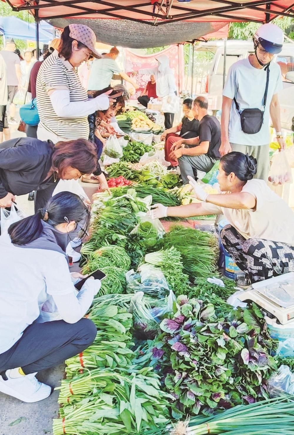 夏日的早市里,菜攤攤主牛麗梅就已經(jīng)擺放好新鮮的蔬菜,泡沫箱里的黃瓜頂著嫩黃的花,筐里的西紅柿還帶著露珠,“這些菜都是半夜起來從地里現(xiàn)摘的,你看看這黃瓜頂花帶刺的,多新鮮。我已經(jīng)在這個早市擺了十來年攤了,人們還是很認可我家的蔬菜,就是累點也覺得挺高興的?!彼裏崆榈卣泻糁皝碣I菜的市民,過秤、算賬,干脆利落,一看就有著豐富的賣菜經(jīng)驗。