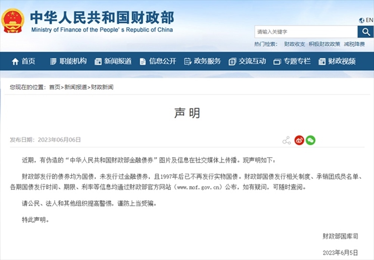·財(cái)政部發(fā)布聲明:發(fā)行的債券均為國(guó)債,未發(fā)行過金融債券。