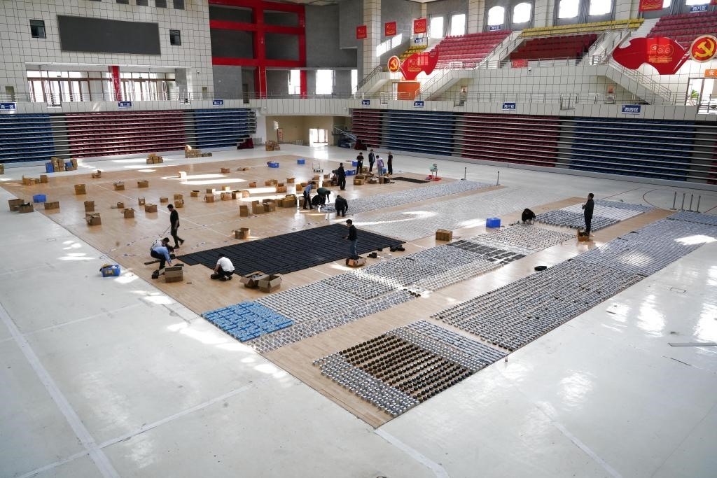 民警在黑龍江省饒河縣一體育館內(nèi)清點(diǎn)繳獲的竊聽(tīng)竊照器材。(饒河縣公安局供圖)