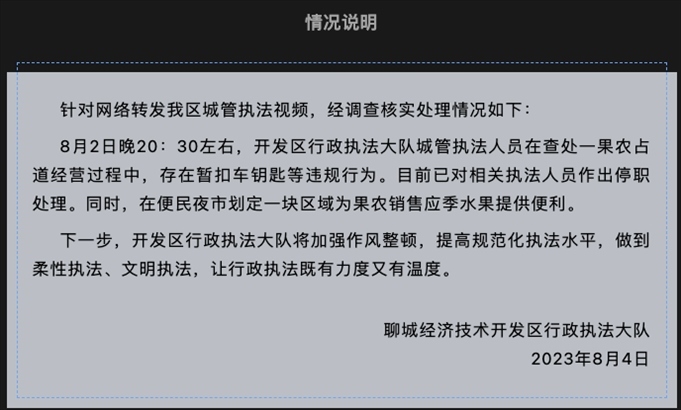 ·山東聊城通報(bào)“城管拔走小販車(chē)鑰匙”:相關(guān)執(zhí)法人員停職。