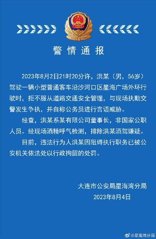 ·大連警方通報(bào)男子自稱(chēng)公務(wù)員威脅交警:非公職人員,已行拘。