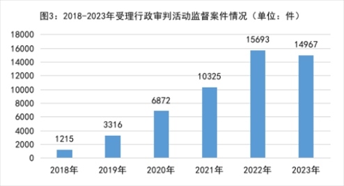 3.行政審判活動監(jiān)督更有實效。2018年以來受理行政審判活動監(jiān)督案件分別是:2018年1215件、2019年3316件、2020年6872件、2021年10325件、2022年15693件,年均增加89.6%。經(jīng)過連續(xù)五年監(jiān)督,監(jiān)督效果初步體現(xiàn)。2023年共受理14967件,同比下降4.6%。其中,依職權(quán)受理占95.5%;依申請受理占4.5%。針對超期立案、超期審理、違反規(guī)定送達法律文書等審判程序違法問題,向法院提出檢察建議13491件,同比下降6.8%。