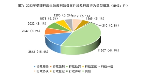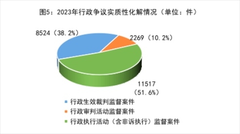 5.行政爭議實質(zhì)性化解持續(xù)深化做實。針對司法實踐中一些行政案件程序已結(jié)但訟爭未解的“程序空轉(zhuǎn)”“案結(jié)事不了”等問題,2023年共促進案涉行政爭議實質(zhì)性化解22310件,同比上升26%。其中,行政生效裁判監(jiān)督案件8524件,占38.2%;行政審判活動監(jiān)督案件2269件,占10.2%;行政執(zhí)行活動(含非訴執(zhí)行)監(jiān)督案件11517件,占51.6%。