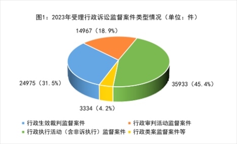 1.行政檢察監(jiān)督職能全面發(fā)展。一方面,訴訟內(nèi)監(jiān)督進一步強化。2023年全國檢察機關共受理行政訴訟監(jiān)督案件79209件,其中,行政生效裁判監(jiān)督案件24975件,占比31.5%;行政審判活動監(jiān)督案件14967件,占比18.9%;行政執(zhí)行活動(含非訴執(zhí)行)監(jiān)督案件35933件,占比45.4%;行政類案監(jiān)督等案件3334件,占比4.2%。另一方面,“訴訟外”監(jiān)督實現(xiàn)新突破。2023年辦理行刑反向銜接案件中對被不起訴人應受行政處罰的提出檢察意見11.3萬人,辦理行政違法行為監(jiān)督案件提出檢察建議3.2萬件。行政檢察各項職能發(fā)展更加全面、更加協(xié)調(diào)。針對行政訴訟、行政執(zhí)法和執(zhí)行活動存在的問題,以抗訴、檢察建議等方式提出監(jiān)督意見17.4萬件。