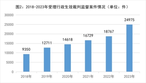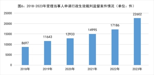 1.依申請監(jiān)督的行政生效裁判監(jiān)督案件數(shù)量逐年上升,反映出人民群眾對檢察監(jiān)督的更高需求。2018年以來當事人不服法院生效裁判向檢察機關申請監(jiān)督的案件分別是:2018年8697件、2019年11643件、2020年12933件、2021年14995件、2022年17186件、2023年22602件,年均增加21%。2023年16個省級檢察院受理行政案件數(shù)超過民事案件。當事人對裁判結(jié)果申請監(jiān)督的同時,很多情況下還對審判和執(zhí)行程序一并主張訴求,追求“看得見”的公平正義。