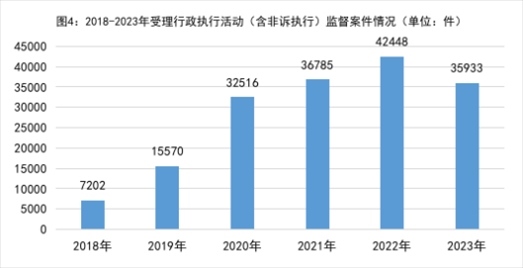 4.行政執(zhí)行活動監(jiān)督發(fā)展迅速,行政非訴執(zhí)行監(jiān)督占主導。2018年以來受理行政執(zhí)行活動(含非訴執(zhí)行)監(jiān)督案件分別是:2018年7202件、2019年15570件、2020年32516件、2021年36785件、2022年42448件,年均增加55.8%。2023年受理35933件,同比下降15.3%。其中,行政非訴執(zhí)行活動監(jiān)督34938件,占97.2%;行政訴訟執(zhí)行活動監(jiān)督995件,占2.8%。針對超期執(zhí)行、執(zhí)行裁定或決定違反法定程序、違法裁定終結(jié)本次執(zhí)行、怠于申請強制執(zhí)行等問題,向法院、行政機關提出檢察建議31790件,同比下降12.8%。
