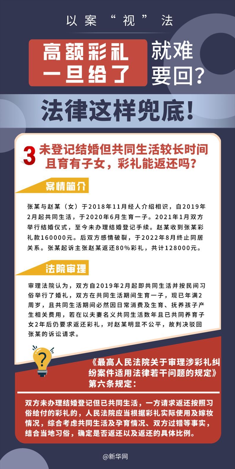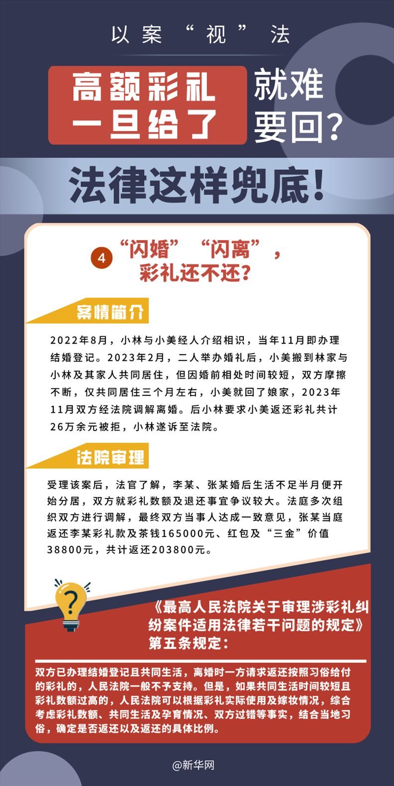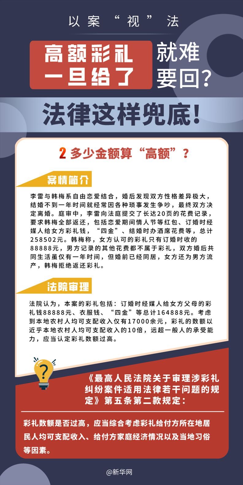 “五一”長假期間,各地迎來了婚禮高峰期,“彩禮”話題,尤其農(nóng)村高額彩禮現(xiàn)象備受關(guān)注。破解高價(jià)彩禮,在解決爭議的層面,司法盡了最大努力兜底。本期《以案“視”法》針對涉“高額彩禮”糾紛,帶大家學(xué)習(xí)相關(guān)法律知識(shí)。