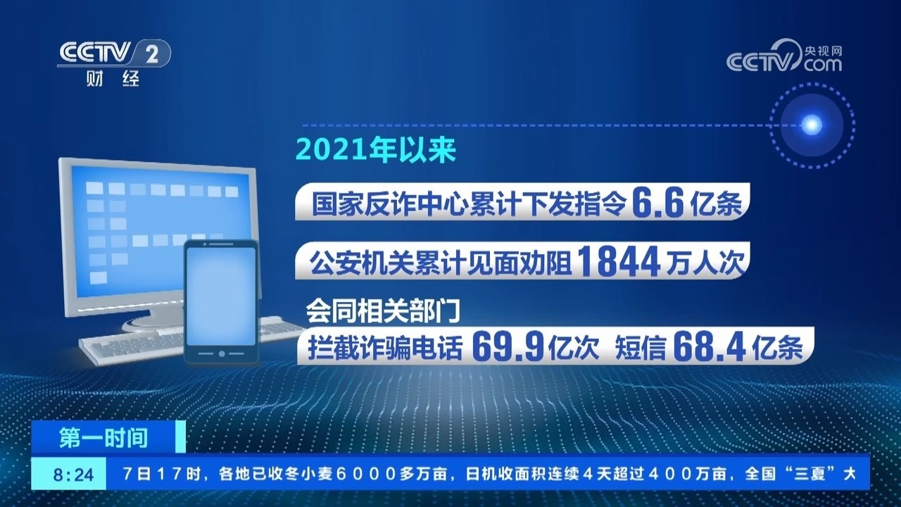 公安機關(guān)持續(xù)推進預(yù)警勸阻和技術(shù)反制工作。2021年以來,國家反詐中心累計下發(fā)指令6.6億條,公安機關(guān)累計見面勸阻1844萬人次,會同相關(guān)部門攔截詐騙電話69.9億次、短信68.4億條,處置涉案域名網(wǎng)址1800萬個,緊急攔截涉案資金1.1萬億元。