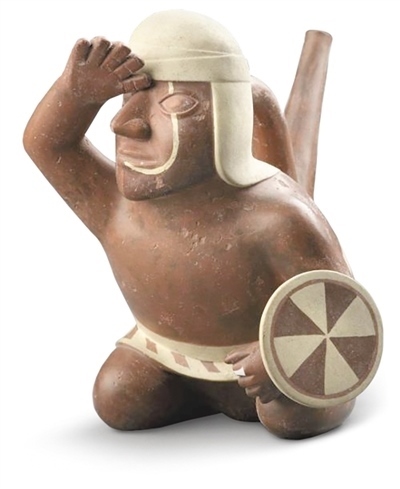 在展廳醒目位置,擺放著一件莫切文明時(shí)期(公元100年—800年)的戰(zhàn)士陶器,他皮膚深褐、高眉大眼、神情堅(jiān)毅,腰間系著白色外衣,頭上戴著布帽。這名戰(zhàn)士身體微微前傾,跪坐在地,左手持盾牌,右手搭于額前,向著遠(yuǎn)方眺望。這件戰(zhàn)士陶器身高雖不足20厘米,卻體態(tài)生動(dòng),僅使用簡練的線條與棕白兩色,便將一位莫切戰(zhàn)士形象刻畫得活靈活現(xiàn)。在雷瓜伊文明時(shí)期(公元前200年—公元650年)的動(dòng)物陶器展臺前,總是有不少孩童圍繞。兇猛的美洲虎、呆萌的羊駝、神秘的未知生物,各種陶器與石器器身僅用黑、紅、白三色裝飾,形態(tài)各異、生動(dòng)活潑,透過玻璃柜懵懂地望向千年后的小觀眾們。