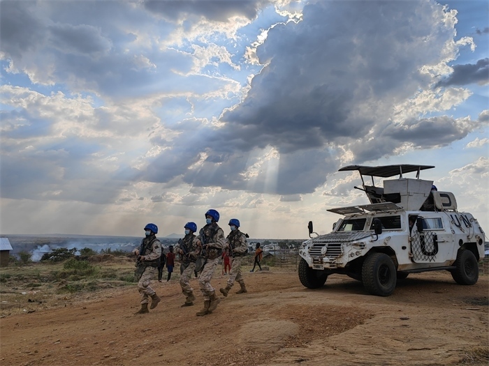 2022年12月,“劉老莊連”隨中國第九批赴南蘇丹(朱巴)維和步兵營奔赴維和戰(zhàn)場,重點(diǎn)擔(dān)負(fù)警戒巡邏、武裝護(hù)衛(wèi)、隔離沖突等維和任務(wù)。截至目前,“劉老莊連”累計(jì)行程1500余公里,高標(biāo)準(zhǔn)完成了各項(xiàng)授權(quán)任務(wù),受到聯(lián)南蘇團(tuán)各級高度贊揚(yáng)。這也是英雄的“劉老莊連”戰(zhàn)旗第一次飄揚(yáng)在非洲大地。