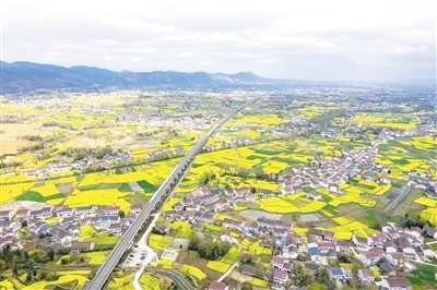 | 陜西省漢中市南鄭區(qū)岳家?guī)X村,一列動(dòng)車組列車在金燦燦的油菜花海中穿行。 曹 欣攝(人民視覺) |