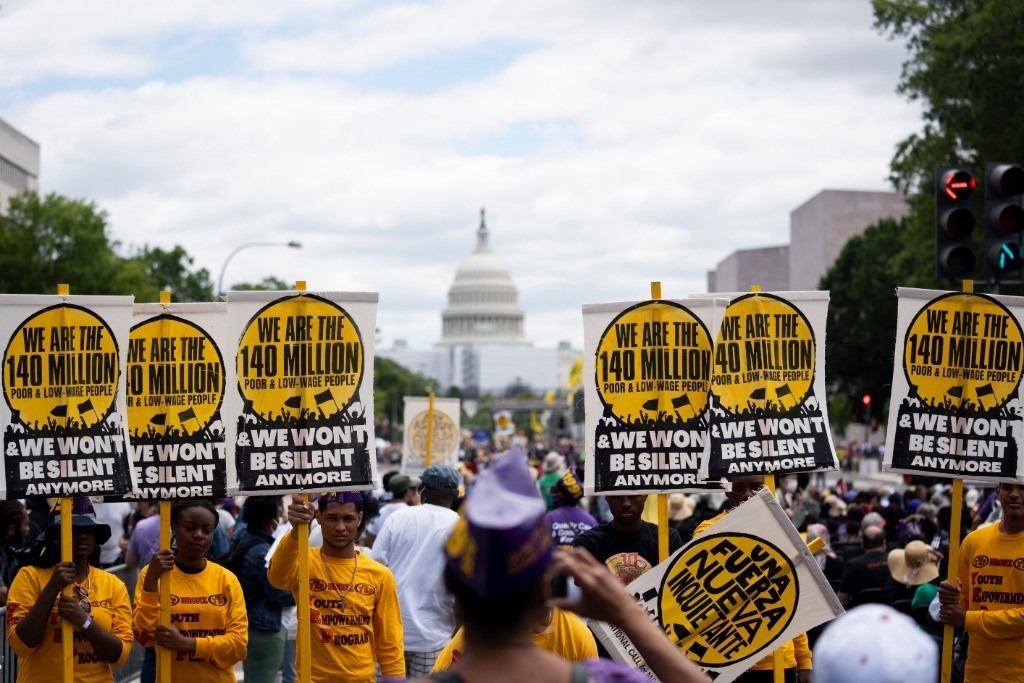 2022年6月18日,來自美國全國各地的數(shù)千民眾在華盛頓國會大廈附近舉行集會,抗議美國根深蒂固的種族歧視以及由此引發(fā)的經(jīng)濟不公等一系列社會問題。新華社記者劉杰攝