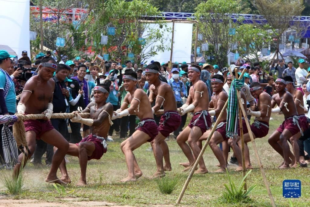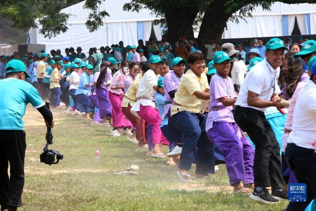4月14日,在柬埔寨暹粒吳哥古跡內(nèi),人們?cè)谒胃晒?jié)慶?;顒?dòng)上參與傳統(tǒng)拔河游戲。