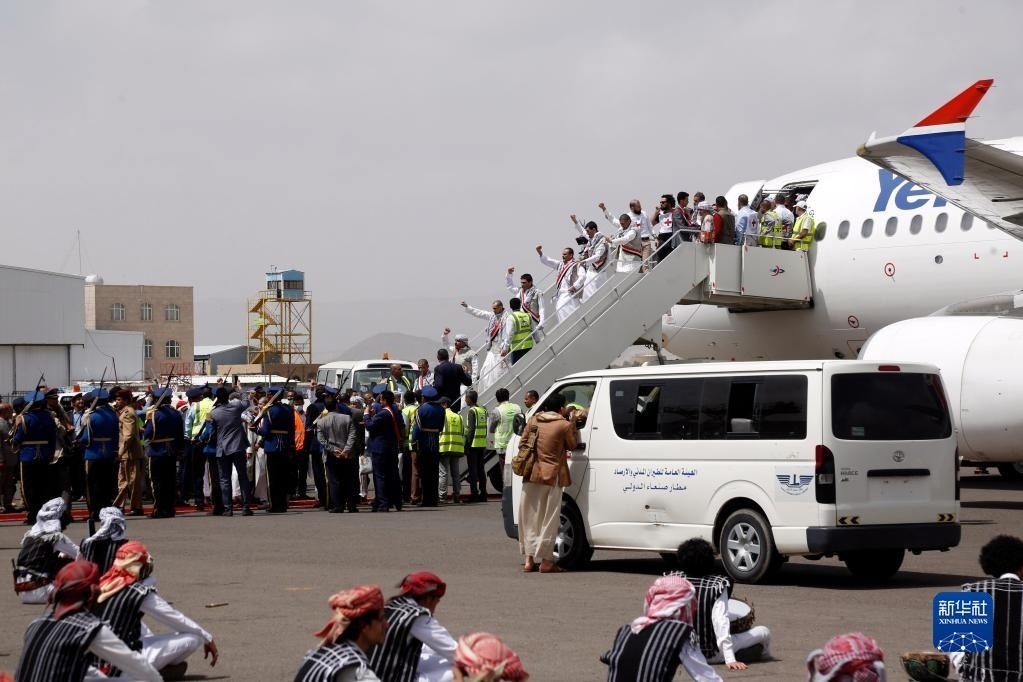 4月15日,在也門(mén)薩那機(jī)場(chǎng),獲釋胡塞武裝戰(zhàn)俘走下飛機(jī)。