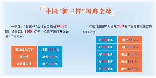今年一季度,中國(guó)外貿(mào)出口逐月向好,實(shí)現(xiàn)良好開局。其中,有外貿(mào)“新三樣”之稱的電動(dòng)載人汽車、鋰電池、太陽能電池表現(xiàn)亮眼,一季度合計(jì)出口增長(zhǎng)66.9%,同比增量超過1000億元,拉高了出口整體增速2個(gè)百分點(diǎn)。