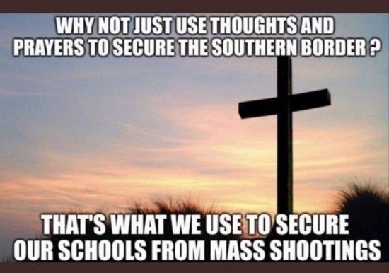 這幅漫畫則諷刺說:“為什么我們不只靠祈禱來阻止非法移民進入美國?我們可是只靠祈禱來保護學(xué)校不發(fā)生大規(guī)模槍擊?!?/p>