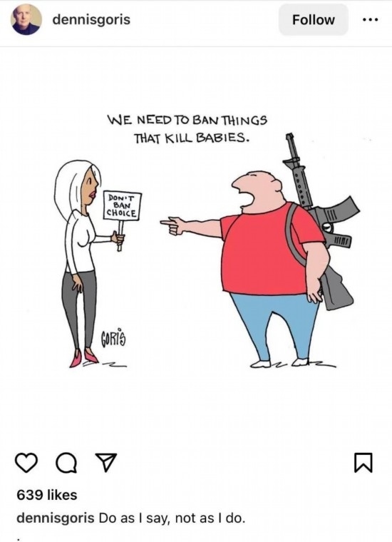 在網(wǎng)友Dennisgoris創(chuàng)作的漫畫中,一名男子指著一名女子說,“我們要禁止殺死嬰兒的政策”,卻無視自己背著的步槍。根據(jù)美國疾控中心等機構(gòu)數(shù)據(jù),槍支暴力是美國兒童和青少年死亡首要原因。