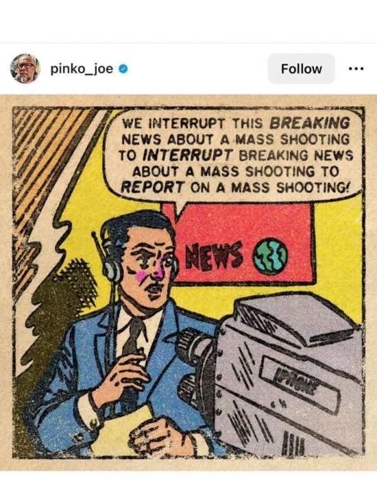 網(wǎng)友Pinko_joe的漫畫主角是一名記者,他對著鏡頭說:“下面讓我們打斷一下關(guān)于大規(guī)模槍擊的突發(fā)報道,臨時插播另一條關(guān)于大規(guī)模槍擊的突發(fā)新聞!”