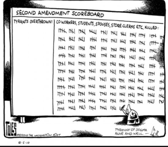 這幅漫畫題為《第二修正案“得分板”》,右邊顯示因為第二修正案死亡的同事、學(xué)生、配偶、商店售貨員等各色人等。美國憲法第二修正案是美國公民擁槍的主要法律依據(jù)。
