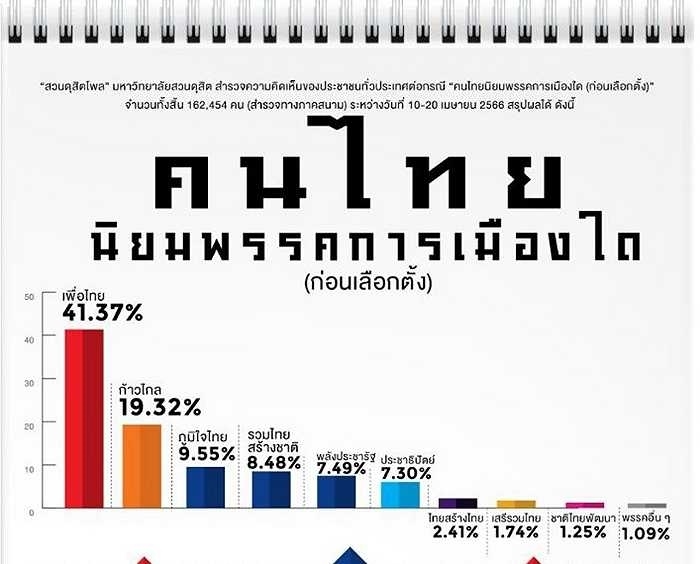 泰國(guó)川登喜大學(xué)民意調(diào)查研究機(jī)構(gòu)統(tǒng)計(jì)顯示,為泰黨在選民中的支持率為41.37%,遙遙領(lǐng)先于前進(jìn)黨的19.32%和泰國(guó)人團(tuán)結(jié)建國(guó)黨的8.48%。巴維所在的國(guó)民力量黨僅7.49%。