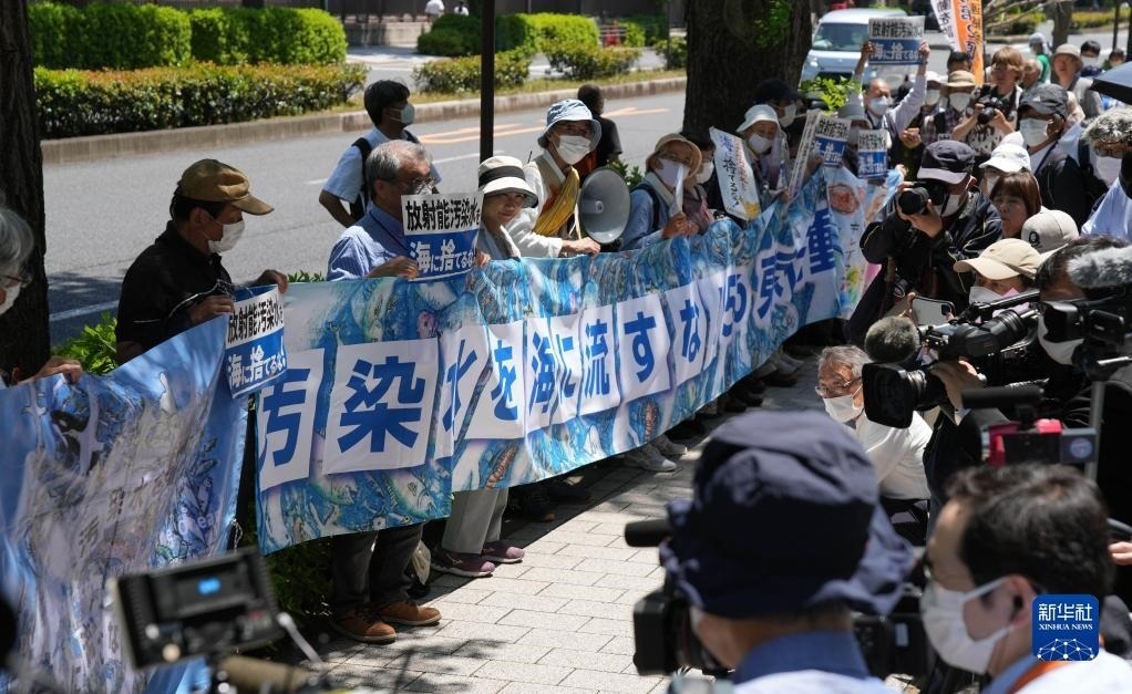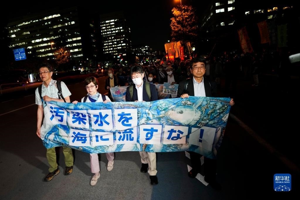 5月16日,在日本東京,民眾要求叫停核污染水排海計劃。   新華社記者 張笑宇 攝