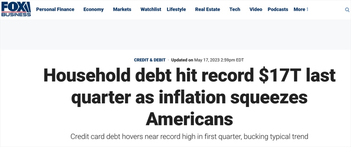 “通脹榨干了美國(guó)人,”對(duì)此,美國(guó)??怂剐侣劸W(wǎng)報(bào)道稱,“自2023年伊始,美國(guó)人的債臺(tái)更加高筑,有越來越多的美國(guó)家庭拖欠貸款。”