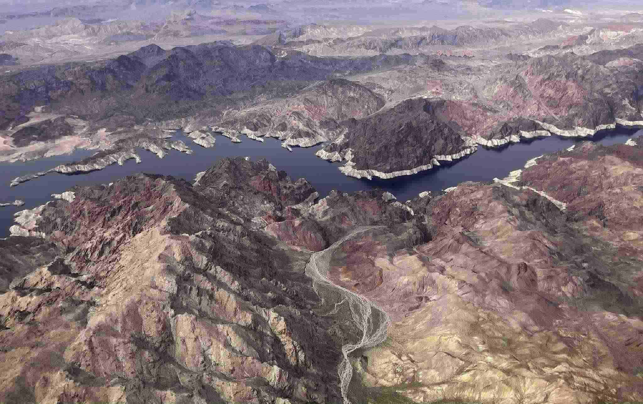 當地時間2023年3月6日,美國內華達州博爾德市,沿著內華達州和亞利桑那州的邊界,“浴缸環(huán)”顯示了米德湖的水位線。