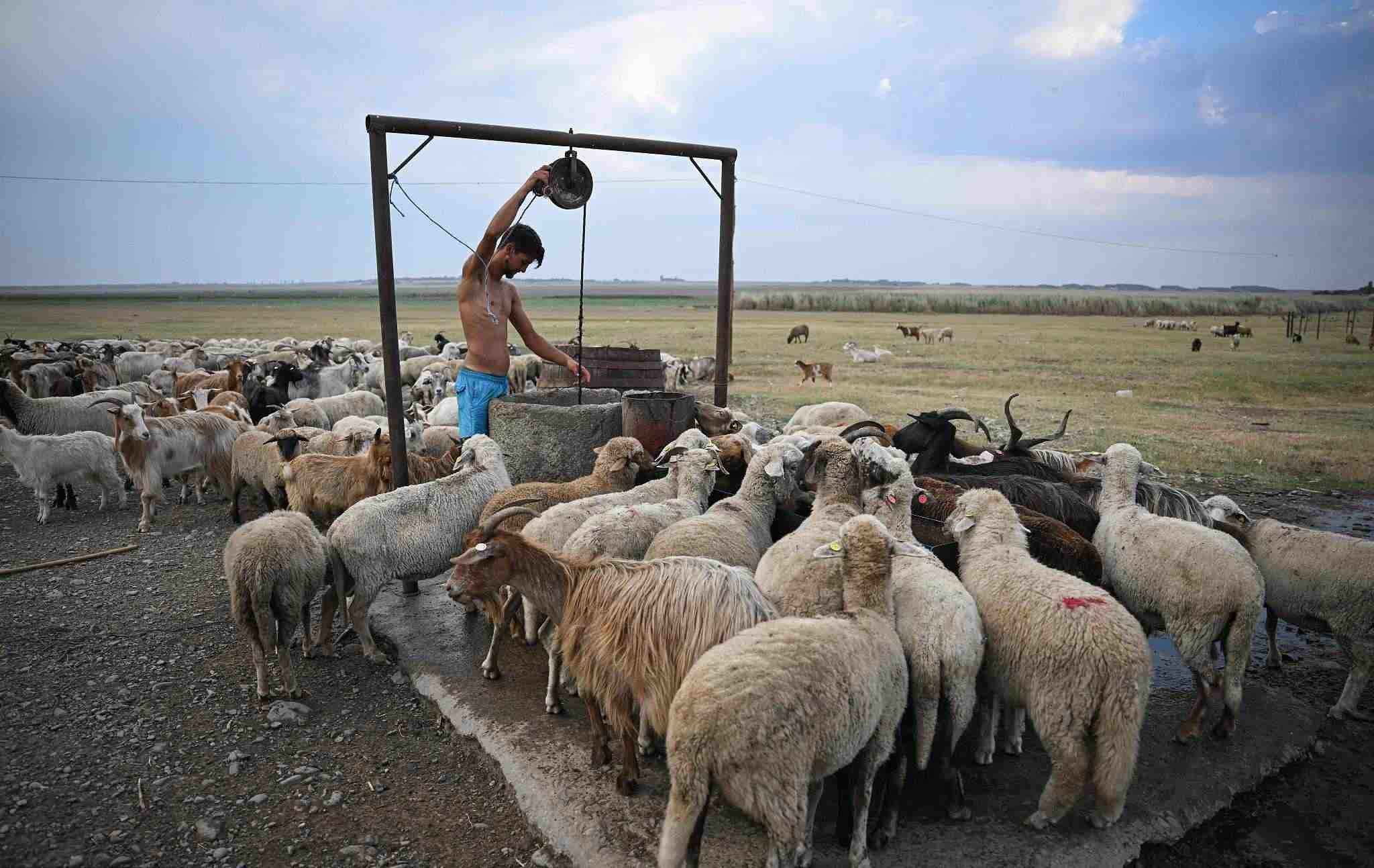 當地時間2022年7月28日,羅馬尼亞斯洛博齊亞,牧羊人在阿瑪拉湖床旁的井打水。