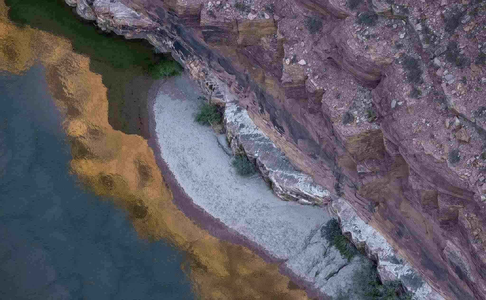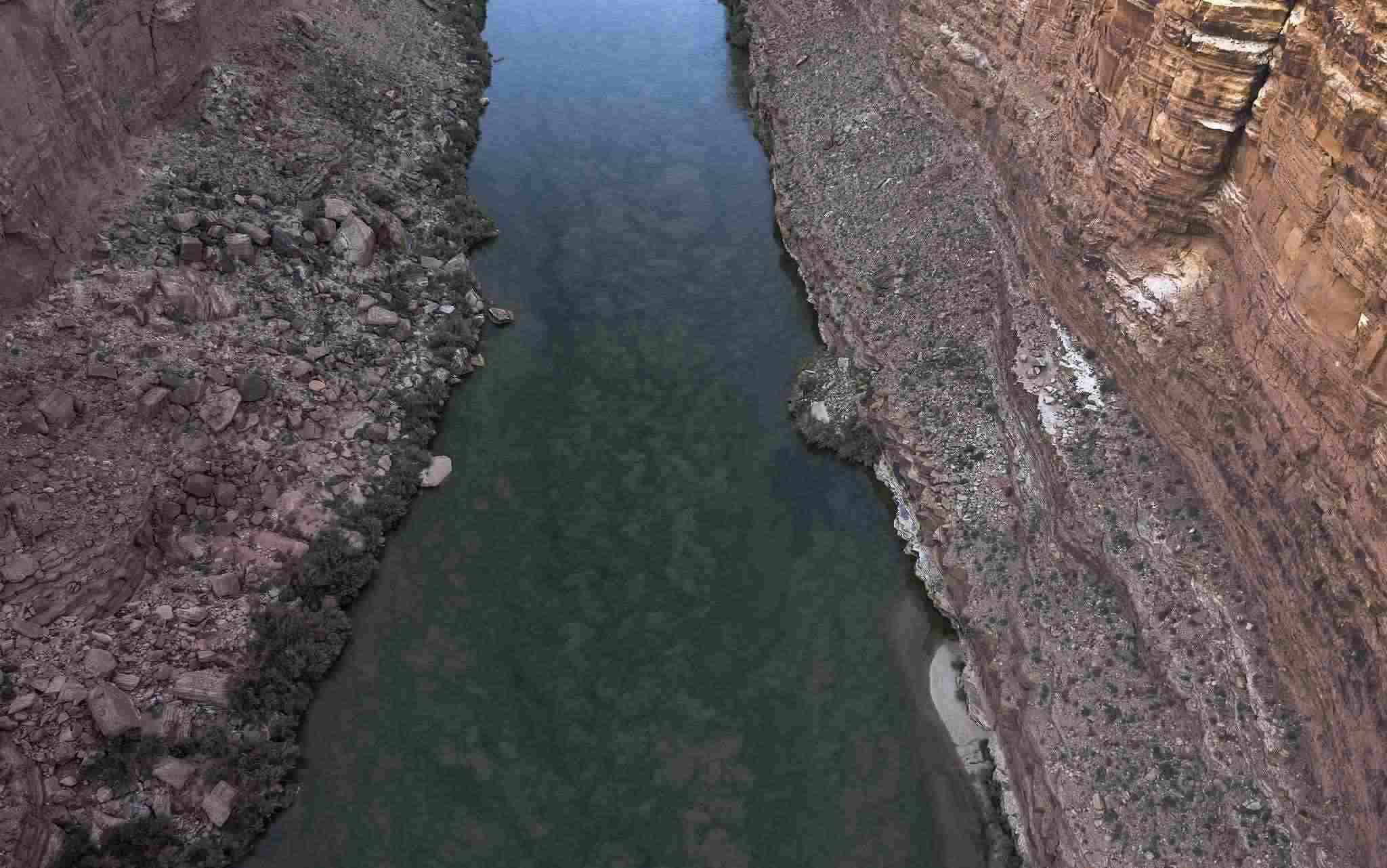 當地時間2022年8月31日,美國亞利桑那州大理石峽谷,當沉積物在流經鮑威爾湖下游的大理石峽谷時,紅色砂巖懸崖倒映在科羅拉多河中。近幾年,氣候變化導致的干旱使美國第二大水庫鮑威爾湖的水位下降。