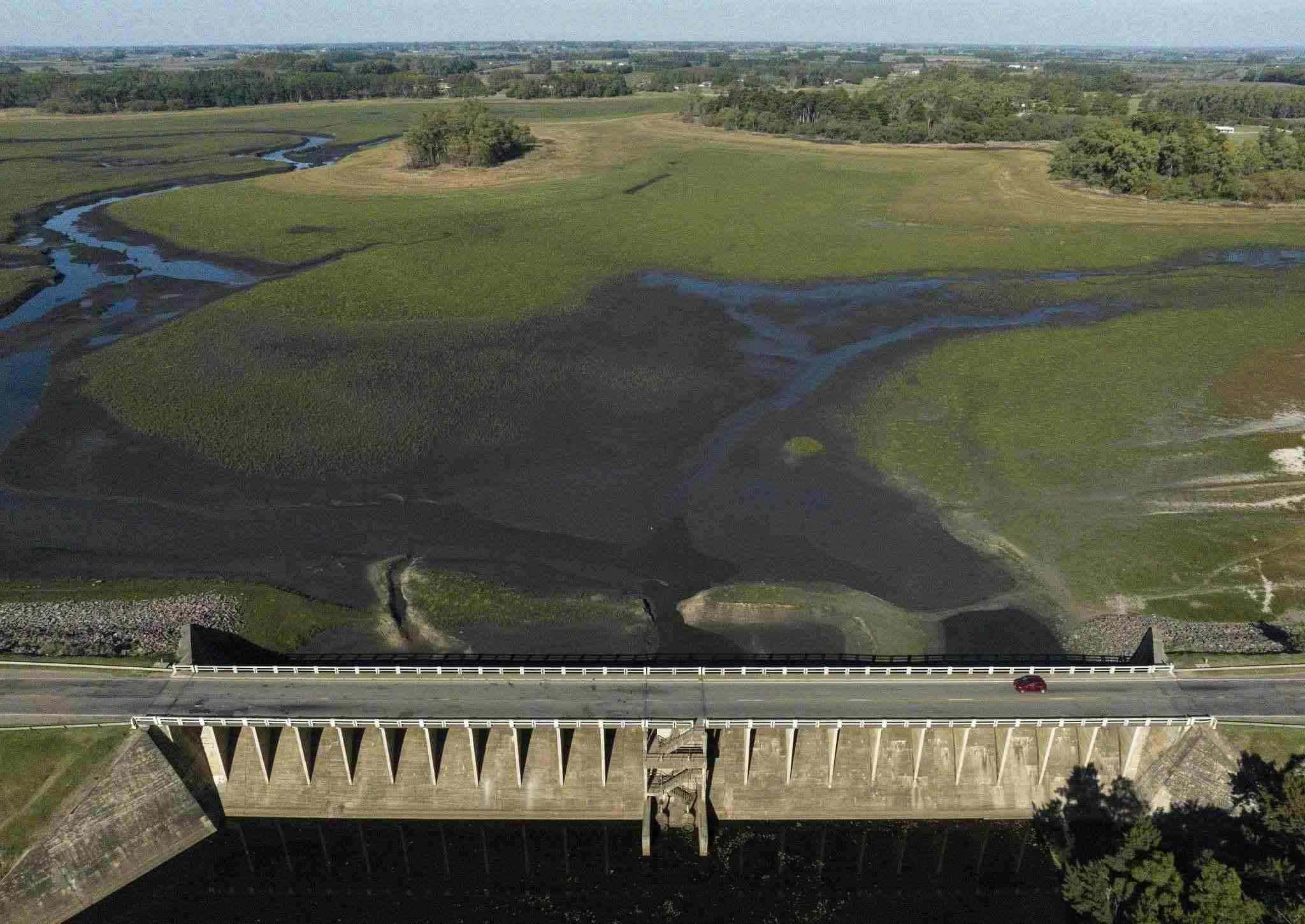 當地時間2023年5月15日,烏拉圭卡內洛內斯,Canelon Grande水庫。烏拉圭持續(xù)的干旱導致蒙得維的亞和大都市區(qū)的飲用水嚴重鹽堿化,附近水庫的水位下降。