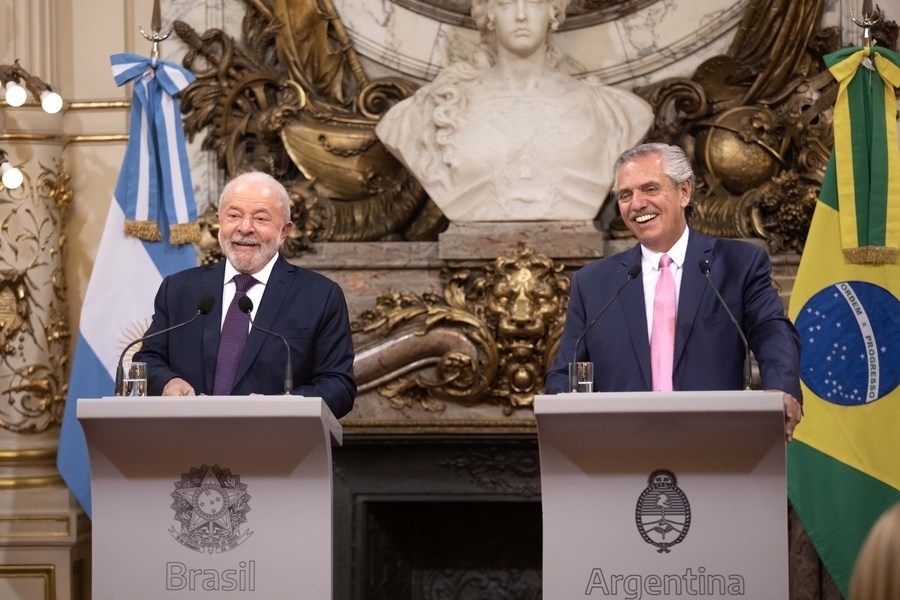 1月23日,在阿根廷布宜諾斯艾利斯,阿根廷總統(tǒng)費爾南德斯(右)和巴西總統(tǒng)盧拉在玫瑰宮出席新聞發(fā)布會。新華社發(fā)(馬丁·薩巴拉攝)