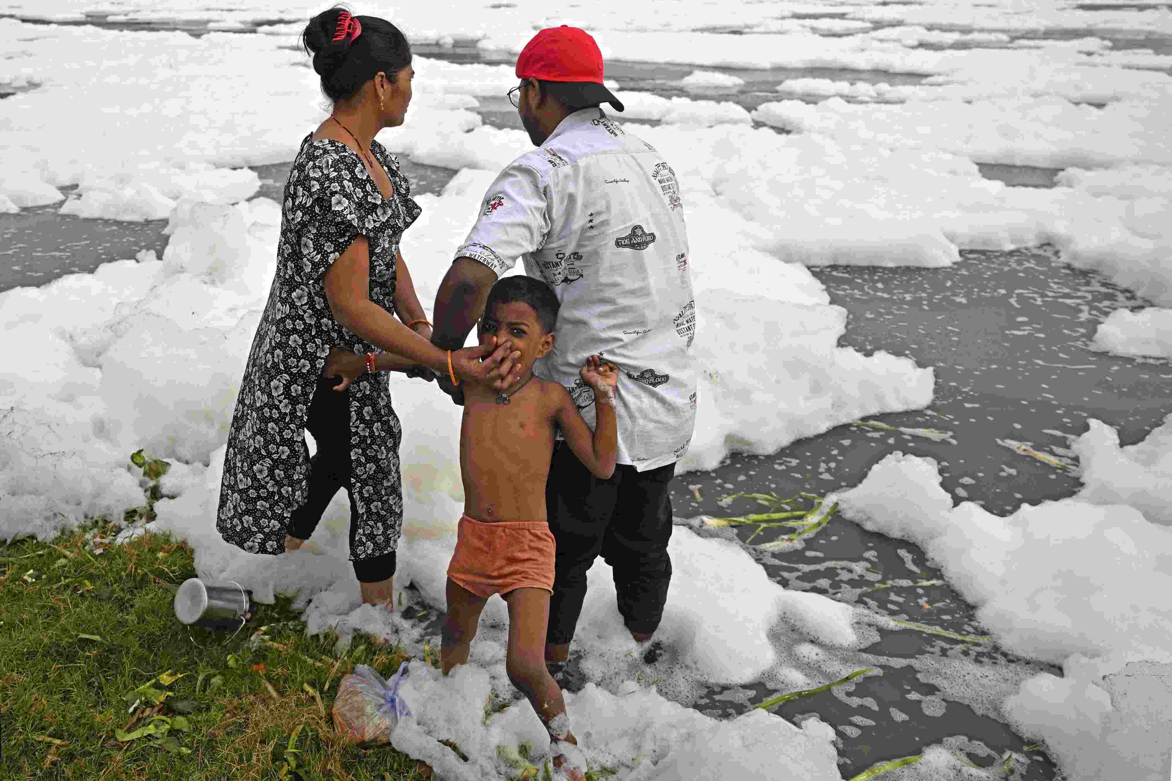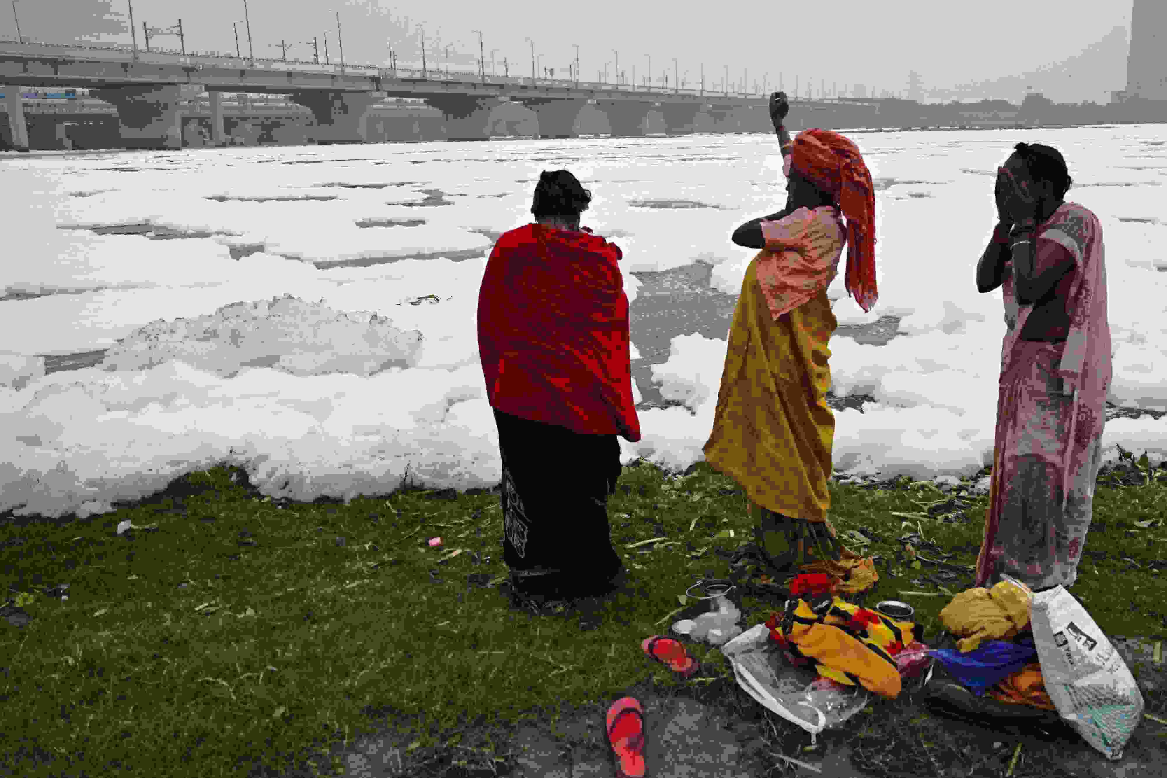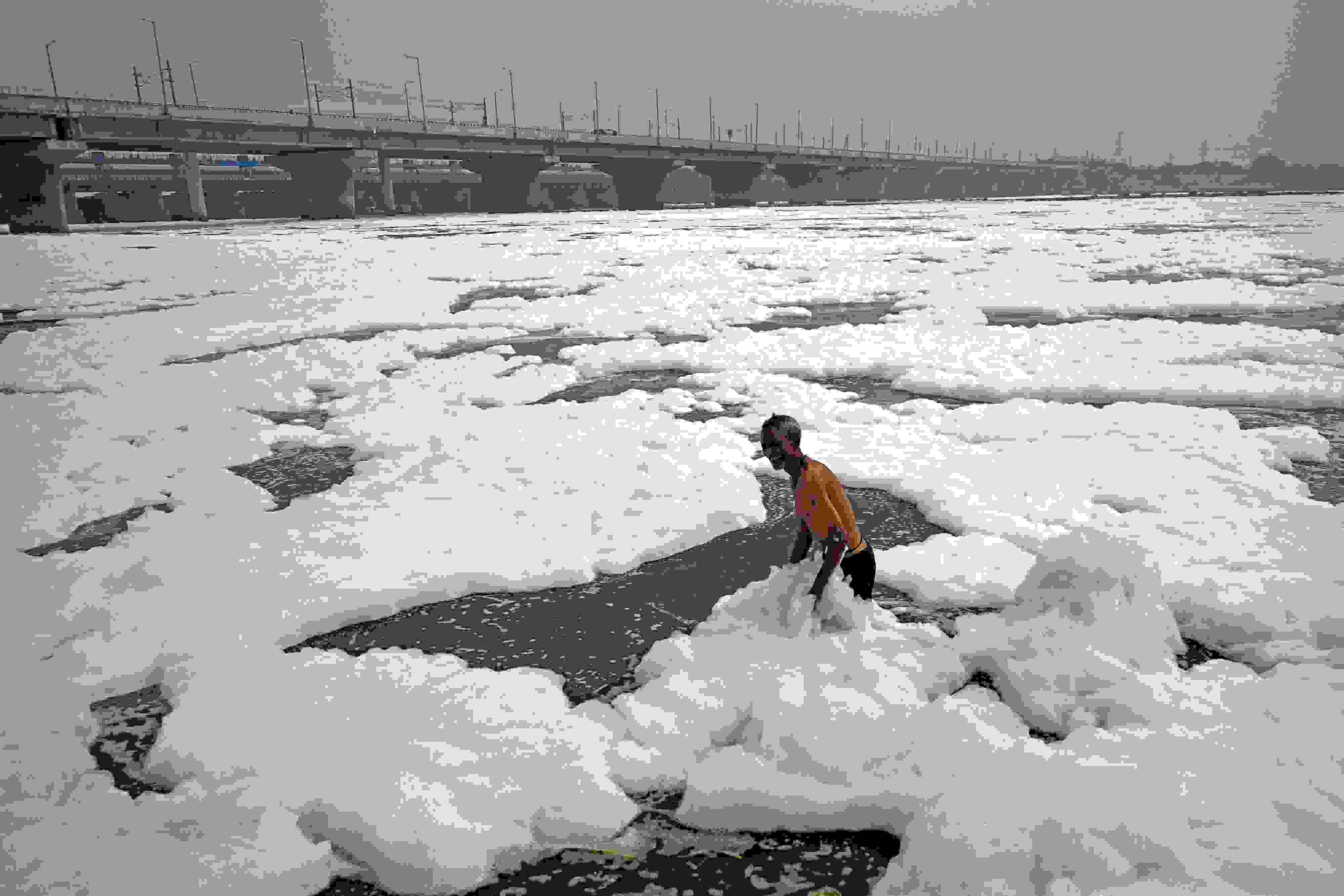 當?shù)貢r間2023年6月4日,印度新德里,世界環(huán)境日前夕,人們在充滿有毒泡沫的亞穆納河中沐浴。 視覺中國
