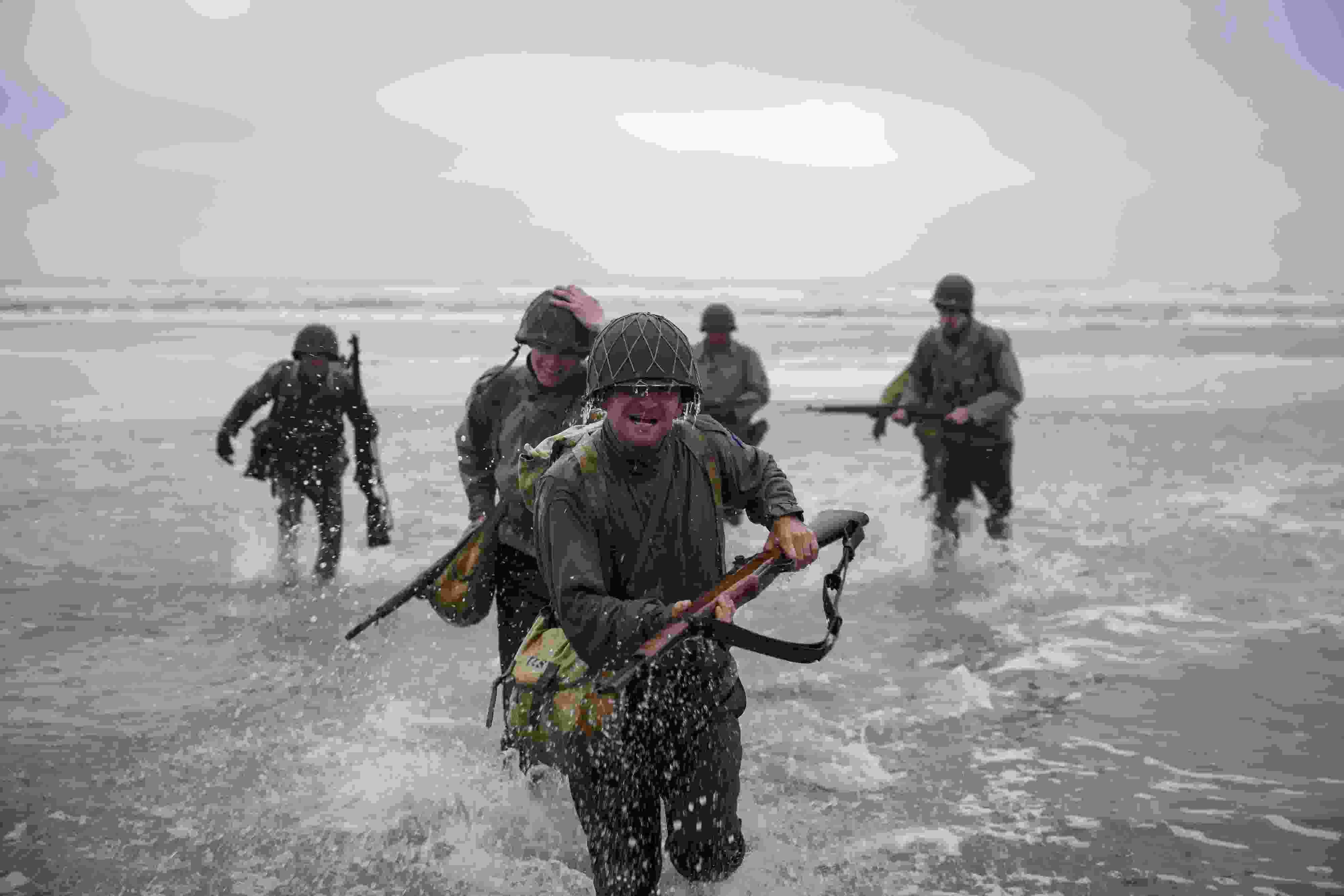 當(dāng)?shù)貢r(shí)間2023年6月6日,法國(guó)奧馬哈海灘,人們重現(xiàn)戰(zhàn)爭(zhēng)場(chǎng)景紀(jì)念諾曼底登陸。1944年6月6日黎明時(shí)分,近16萬(wàn)盟軍在諾曼底登陸。 視覺(jué)中國(guó)