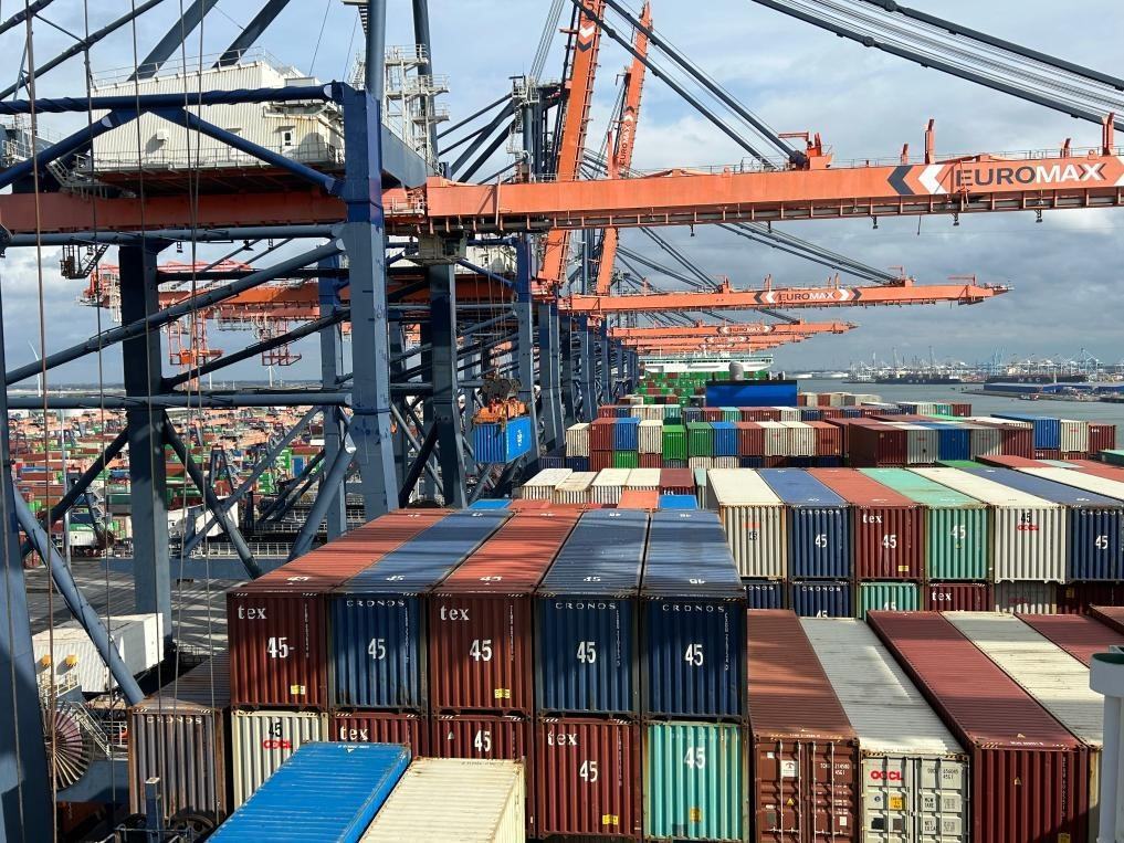 9月20日,“中遠(yuǎn)海運(yùn)室女座”號集裝箱船停靠在荷蘭鹿特丹港作業(yè)。新華社發(fā)