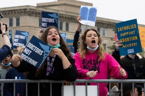 2022年5月3日,在美國華盛頓,支持和反對墮胎權(quán)的人們在美國聯(lián)邦最高法院外集會。新華社發(fā)(亞倫攝)