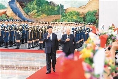 | 七月十八日下午,國(guó)家主席習(xí)近平在北京人民大會(huì)堂同來(lái)華進(jìn)行國(guó)事訪問(wèn)的阿爾及利亞總統(tǒng)特本舉行會(huì)談。這是會(huì)談前,習(xí)近平在人民大會(huì)堂北大廳為特本舉行歡迎儀式。新華社記者 翟健嵐攝 |