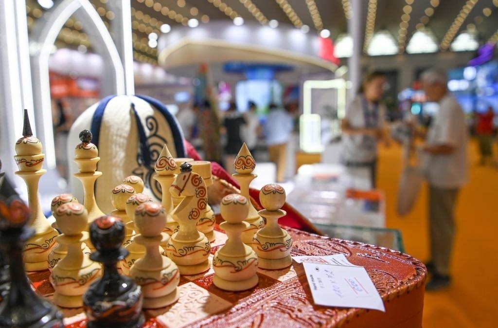 8月17日,參觀者在交流合作館吉爾吉斯斯坦展區(qū)了解特色商品。新華社記者 鄒競一 攝