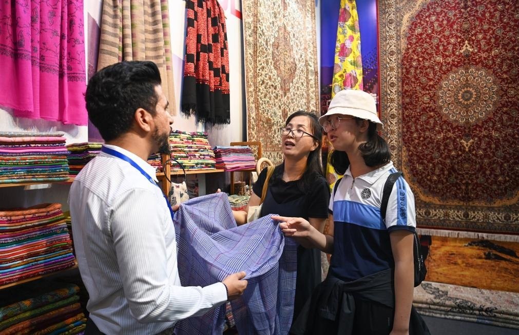 8月17日,參觀者在交流合作館尼泊爾展區(qū)了解特色商品。新華社記者 鄒競一 攝