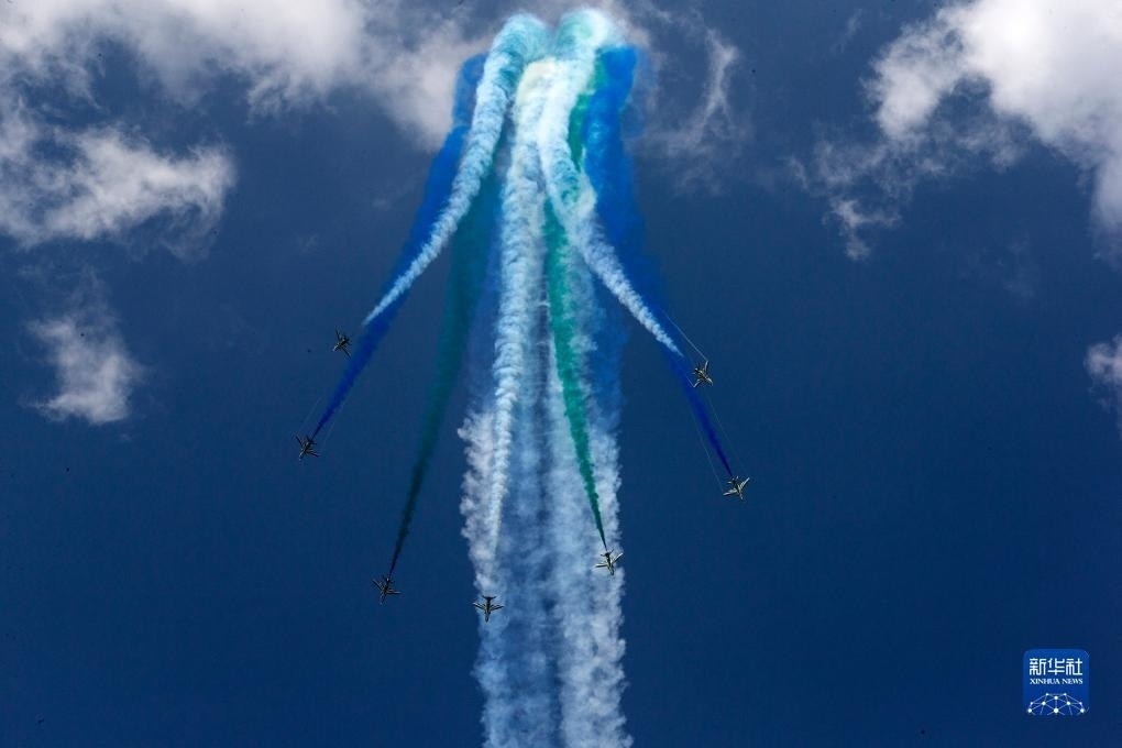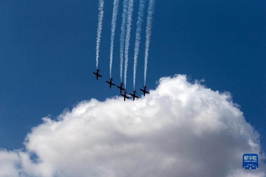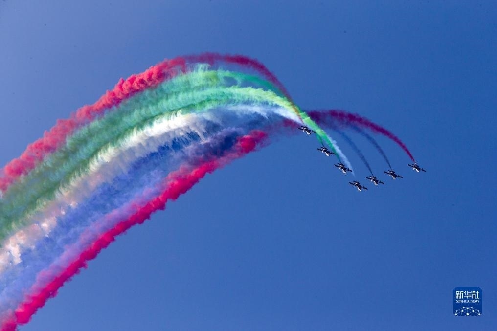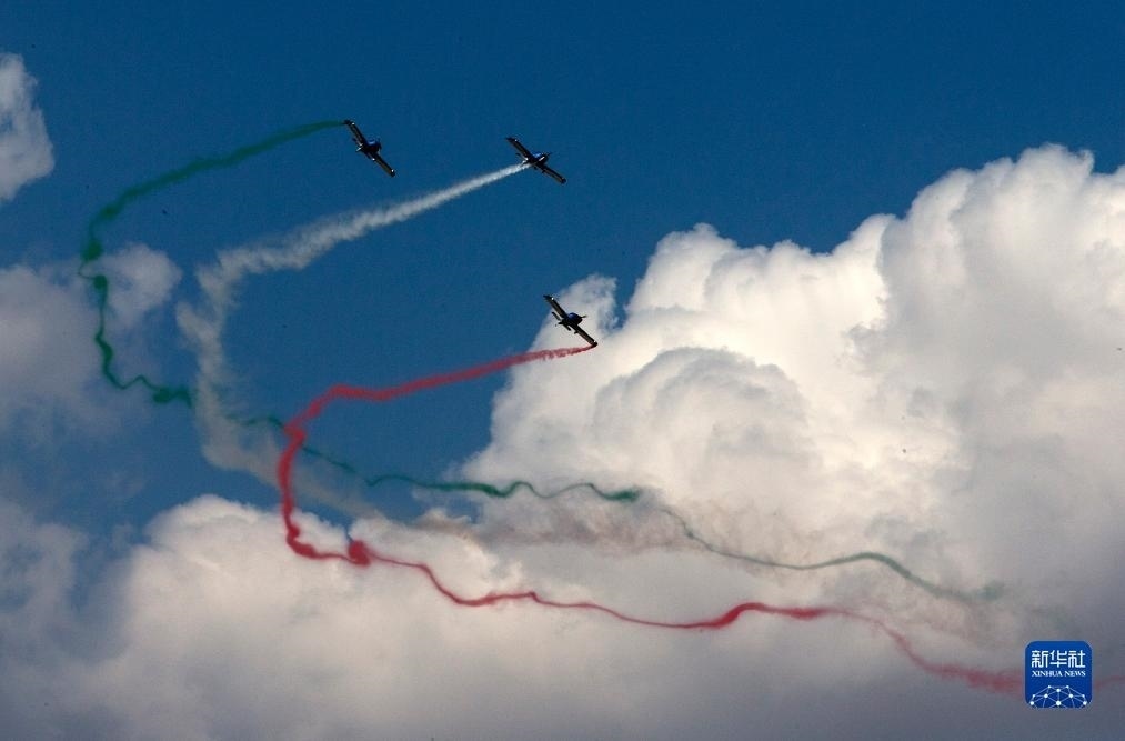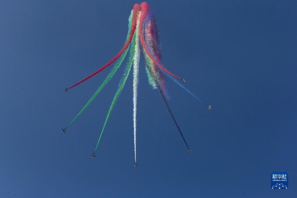 9月2日,在希臘塔納格拉空軍基地的雅典飛行周上,來自阿聯(lián)酋的飛行表演隊進(jìn)行表演。新華社發(fā)(馬里奧斯·羅洛斯攝)