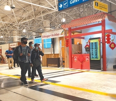 旅客經(jīng)過埃塞俄比亞博萊國際機場內(nèi)的中文服務(wù)臺。本報記者 萬 宇攝