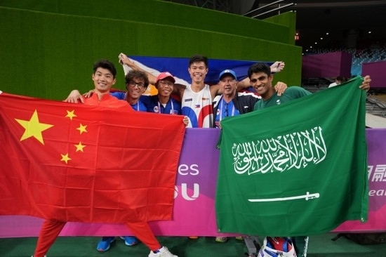 9月30日,菲律賓選手奧貝納(右三)、中國選手黃博凱(左一)和季軍沙特阿拉伯選手希扎姆(右一)在杭州亞運(yùn)會田徑項(xiàng)目男子撐桿跳高決賽后合影。新華社記者 李一博 攝
