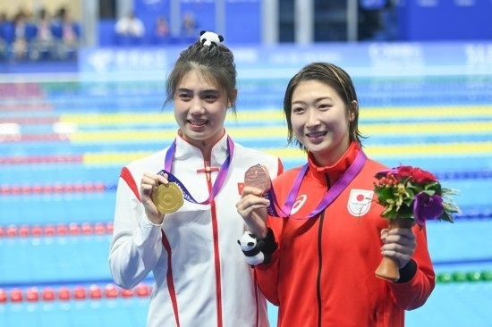 9月29日,冠軍中國選手張雨霏(左)和季軍日本選手池江璃花子在杭州亞運(yùn)會游泳項(xiàng)目女子50米蝶泳頒獎儀式后。新華社記者 黃宗治 攝